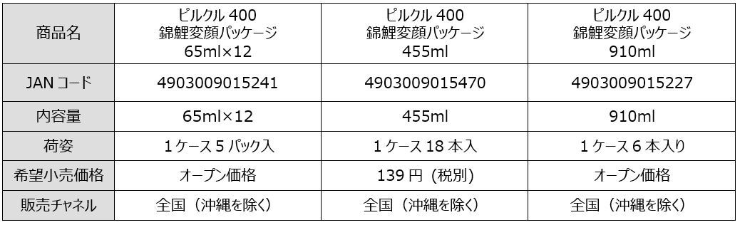 期間限定で「ピルクル400 Ca&V 65ml×12」、「ピルクル400 Light 910ml」、「ピルクル400鉄分 910ml」で錦鯉のパッケージが登場します。