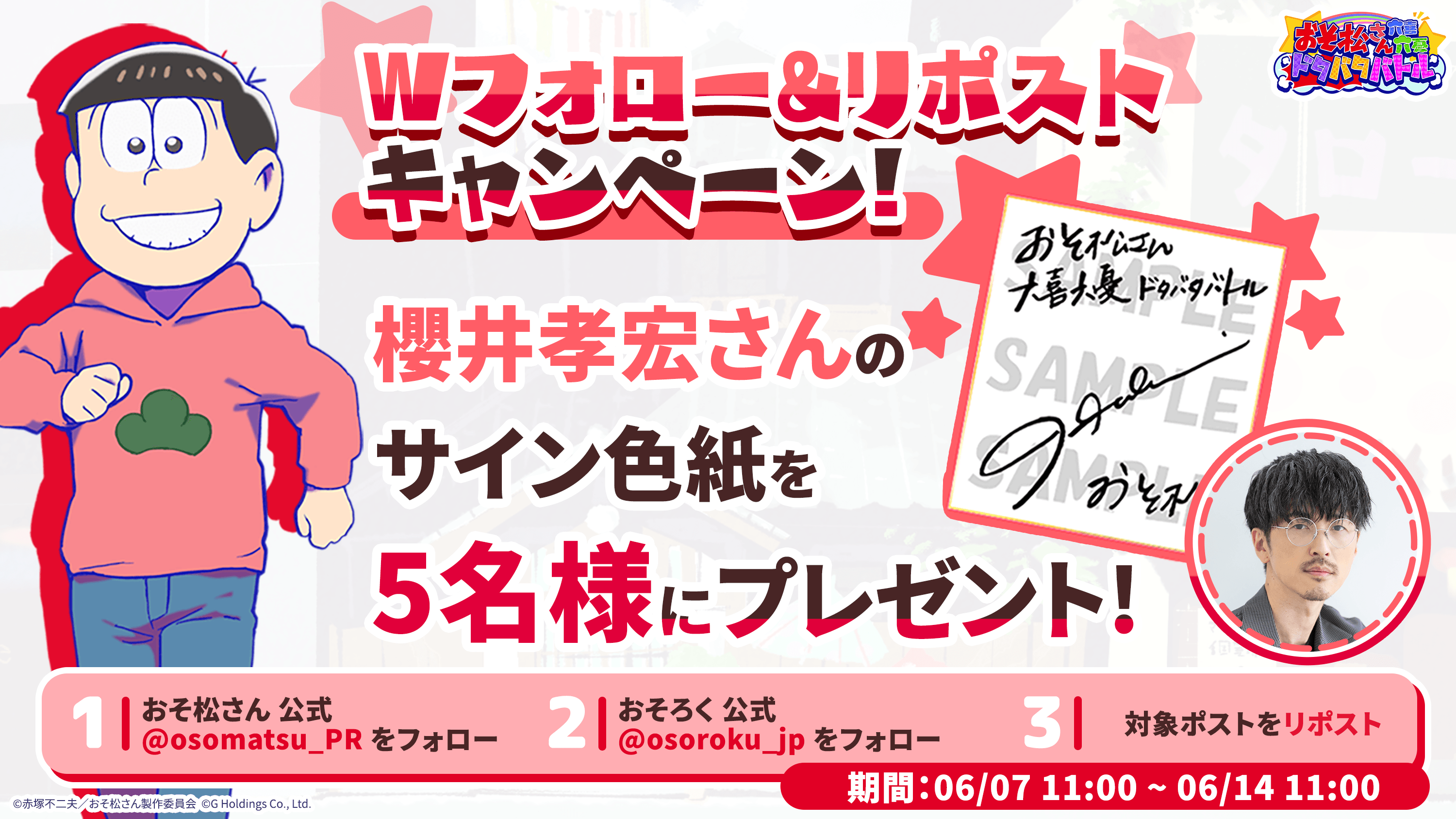 2025年6月7日(土)よりおそ松さん公式X( https://x.com/osomatsu_PR )にて、Wフォロー&リポストキャンぺーンを開催予定です。3つの条件を満たせば応募が完了!応募してくれた方の中から抽選で5名におそ松役、櫻井孝宏さんのサイン色紙をプレゼントします。