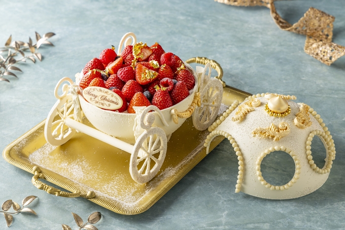 クリスマスにふさわしいキラキラと輝く馬車をイメージした、優美なシグネチャーケーキです。ホワイトチョコレートでかたどった馬車のキャリッジのような球体部分の中には、約 30 個もの苺を贅沢に使用しました。ケーキは 2 層仕立てになっており、異なる味わいが織りなすハーモニーをお楽しみいただけます。上段は、濃厚でとろけるような生クリームで苺をサンドしたリッチなショートケーキ。下段は、くちどけなめらかなクレームダンジュです。その間には、ロンネフェルト社の冬季限定「レッドベイクドアップル」ティー(ノンカフェインのハーブティー)を使用したダコワーズと苺ジャムを挟みました。焼きリンゴのような香りが、ショートケーキとクレームダンジュを絶妙につなぎます。見た目の華やかさだけでなく、細部までこだわり抜いた特別な日のためのケーキです。