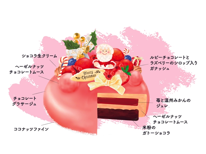 プレゼントを運ぶサンタクロースがツリーにぶつかり、オーナメントが落ちてしまった…そんなストーリーを表現したクリスマスムースケーキです。ベースは、米粉を使用した濃厚でしっとりとしたガトーショコラ。その上に、軽やかなヘーゼルナッツチョコレートのムースを重ね、センターには苺と温州みかんの爽やかなジュレを忍ばせました。温州みかんのジュレが濃厚なチョコレートのアクセントになっています。ケーキのトップには、サイズの異なるピンクのオーナメントがころんと可愛らしく飾られています。大きな球体のオーナメントはケーキと同じヘーゼルナッツチョコレートムース、小さなオーナメントはルビーチョコレートとラズベリーシロップのガナッシュを閉じ込めたチョコレートです。