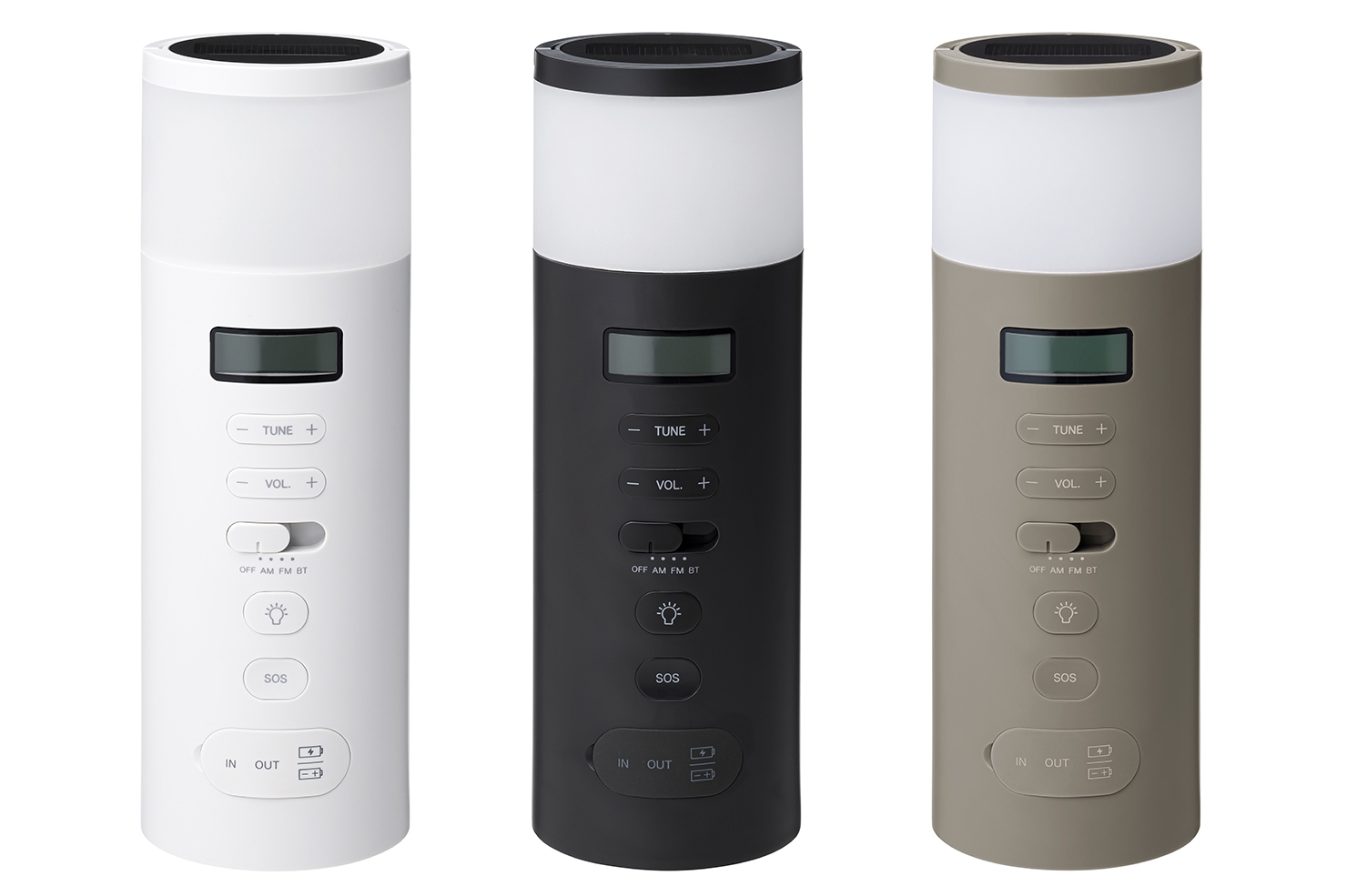 操作性を高めるために正面に全ての操作ボタンを集め、ACアダプター、ソーラーパネル、手回し充電ハンドル、乾電池、蓄電池の5種類から電源を確保できます。さらに、収納できる持ち手を起こせばランタンとしても使用可能で、電球色と昼光色の2段階調光が可能です。