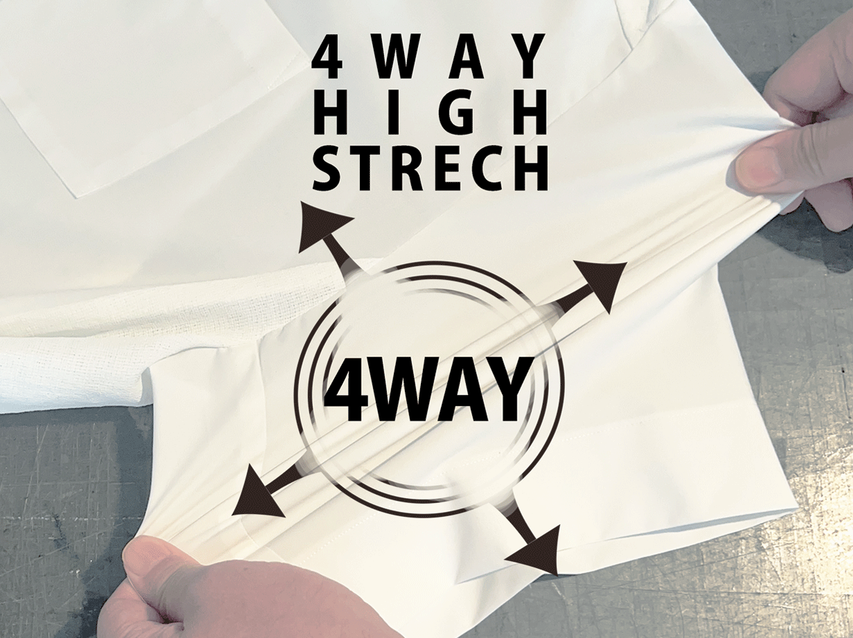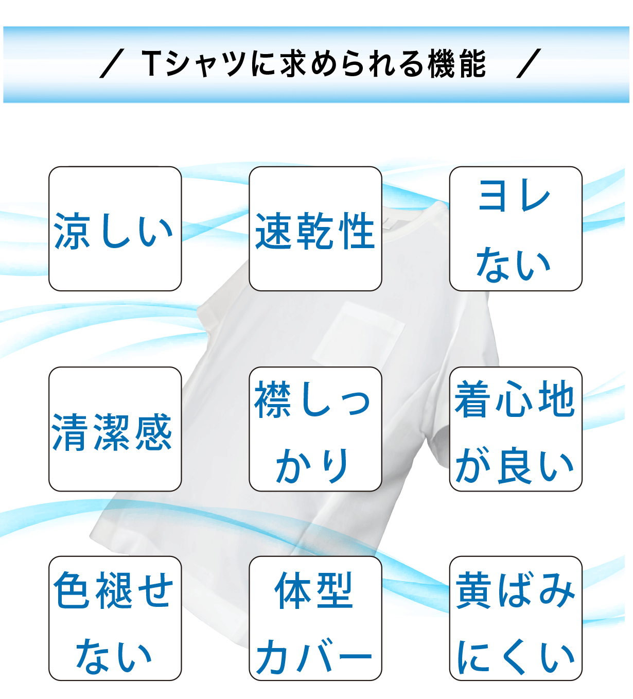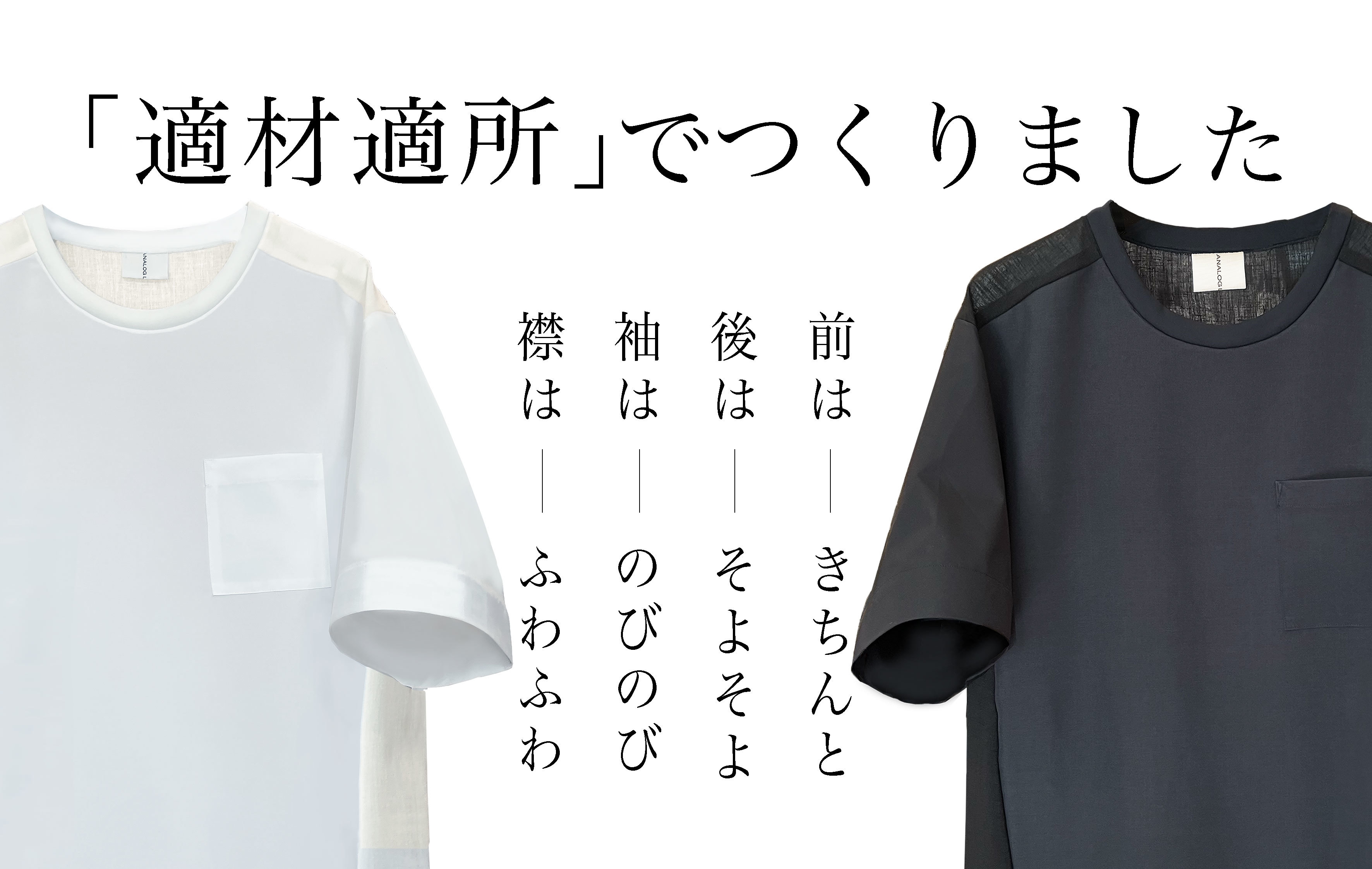 「シャツT」もこれに学び、1着にクセの強い4つの素材を組み合わせたことで、9つのお悩み解消を実現しました。