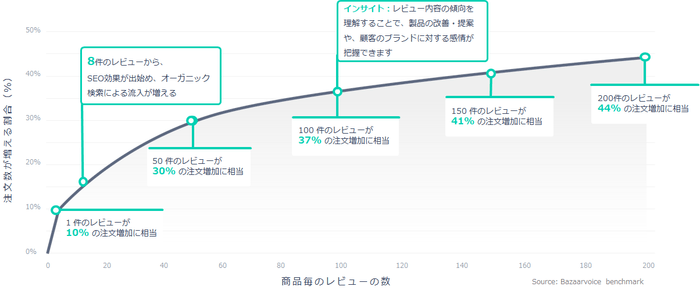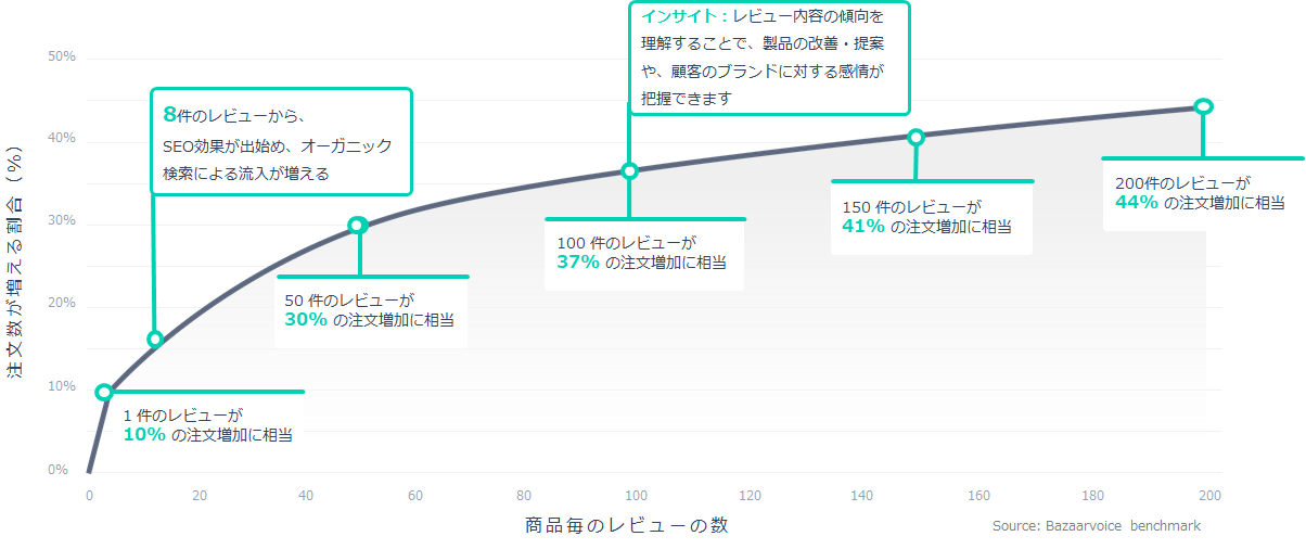 ECサイトの売り上げを支える重要な要素の一つが、カスタマーレビュー・動画・画像等を含む、UGCです。EC市場は年々成長しており、いまや商品購入前のクチコミ等のUGCを活用した比較検討が一般的になってきています。Bazaarvoiceの調査では、レビュー件数が増加するほど注文数が増えることが実証されています。また、UGCをウェブサイトに取り入れることで、新鮮でリッチなコンテンツを多く表示することができ、その結果SEO効果を得ることができます。
