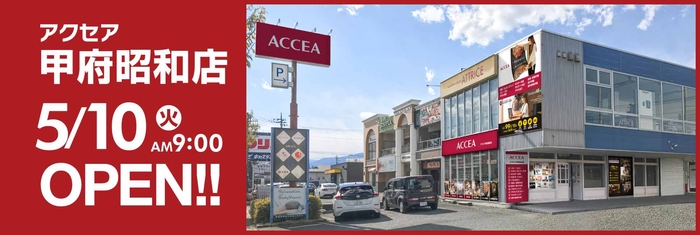 株式会社アクセア(本社:東京都千代田区、代表取締役社長:吉田忠司、以下アクセア)は、モテギ株式会社(本社:山梨県中巨摩郡 代表取締役:茂手木誠)とフランチャイズ加盟契約を締結し、アクセア甲府昭和店を2022年5月10日(火)9:00にオープンいたします。
