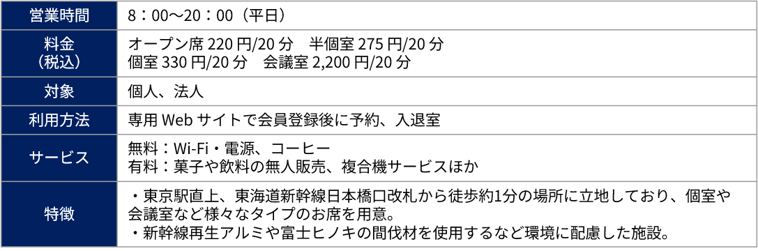 JR東海が運営する東京駅直上のワーキングスペース( https://expresswork.jr-central.co.jp/lounge/ )