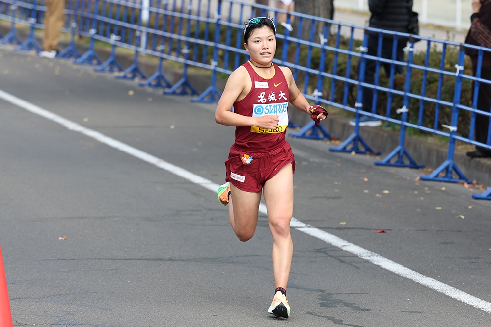 5000mで毎年自己記録を更新し、最終学年では大記録を樹立。米田監督も「理想的なタイムの伸び方」と讃えている。この駅伝でも独走状態のなかで快走し、小林成美選手(4年)が2020年に打ち立てた区間記録に並ぶ21分37秒の区間タイ記録で区間賞を獲得。「狙っていた区間新記録は出せなかったのですが、成美と同じタイムということで、お揃いになってうれしいです」と喜んだ。この区間で後続チームの順位は変動。立命館大学が4位から2位に浮上、日本体育大学が3位、大東文化大学が4位と、往年のライバル校たちがこの区間で順位を上げていたが、名城大学は2位に1分32秒差と大きくリードして次の区間へタスキをつないだ。