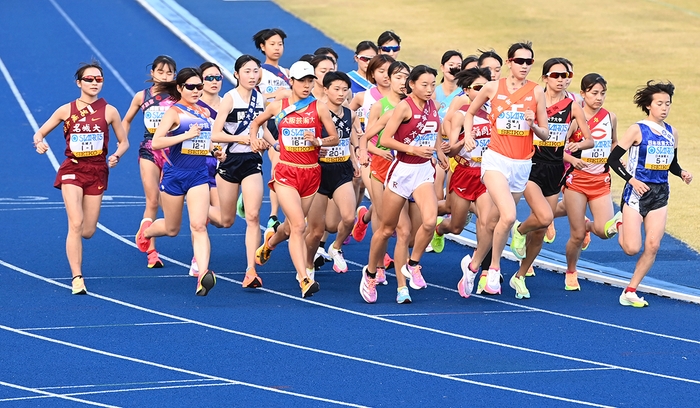6.6kmの1区は1年生の米澤奈々香選手が任された。今シーズン前半は膝のケガで走れず苦しんだ時期もあったが、10月1日の「Athletics Challenge Cup 2022」(新潟市)の5000mで15分31秒63と自己記録(15分31秒33)に迫るタイムをマークして復調をアピール。準備万端でこの日を迎えていた。スタートの競技場内で早くも先頭に立つと、最初の1kmは3分07秒で通過。先頭争いは序盤から立命館大学の村松結選手(1年)との2人に絞られたが、米澤選手が4km付近でスピードを切り替えて村松選手を突き放した。