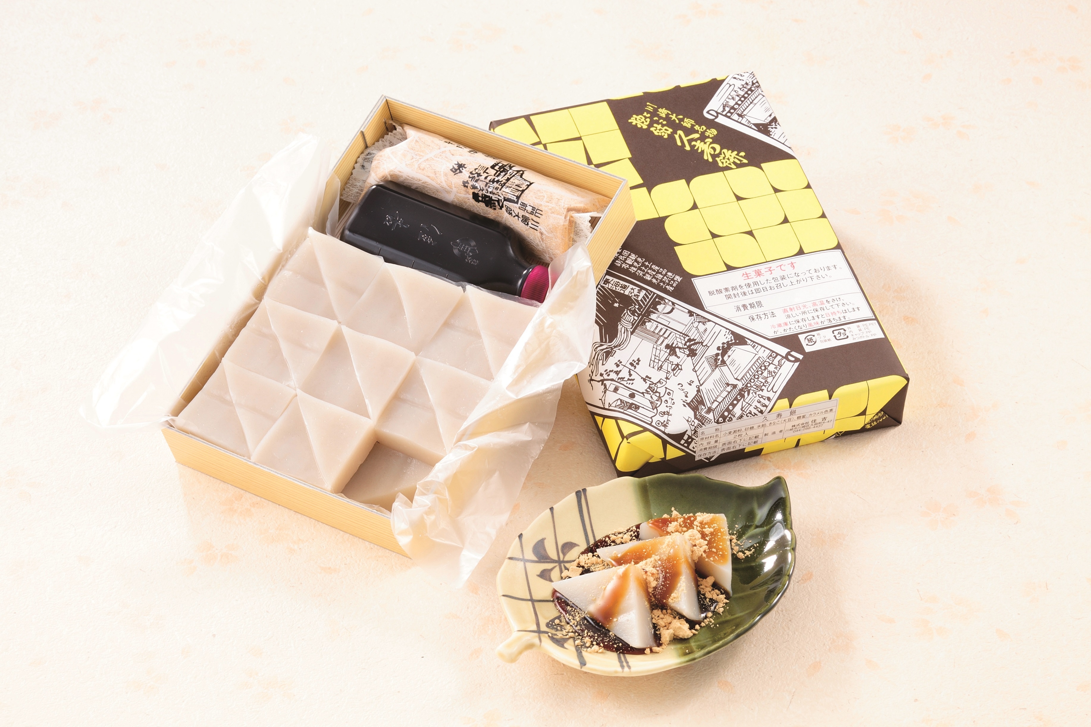 川崎大師名物「独鈷 久寿餅」は、もっちりとした食感に繊細な味わいで香ばしいきな粉と濃厚な黒蜜を絡めると絶妙な風味が口福へと誘います。