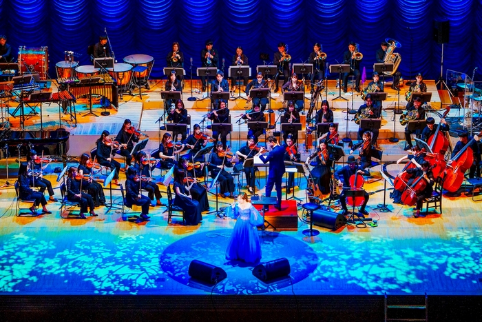 コンサートは静かなピアノ演奏の中、柔らかなブルーの衣裳で登場した平原の『明⽇』の歌唱から始まった。大きな拍手の中、やさしい歌声とハープの音色で始まり、オーケストラの演奏が加わると、温かで重厚感のある空気が客席を包み込む。そのままアイルランド民謡のカバー『Danny Boy』、『ありがとう』、『Don’t Cry』と続き、耳と心に音楽が満ちていくような時間に浸る。歌い終えた平原が客席に「こんばんは!」と声をかけると、観客も「こんばんは!」と返すとうれしそうな笑顔を見せ、「平原綾⾹Jupiter基⾦ の活動に賛同し、来てくださってありがとうございます。今日はみなさんに感謝の気持ち、そして能登半島地震で被災された方々に届けたいと思います。最後まで楽しんでください」と挨拶。ピアノ伴奏で『からっぽのハート』を歌いあげた。
