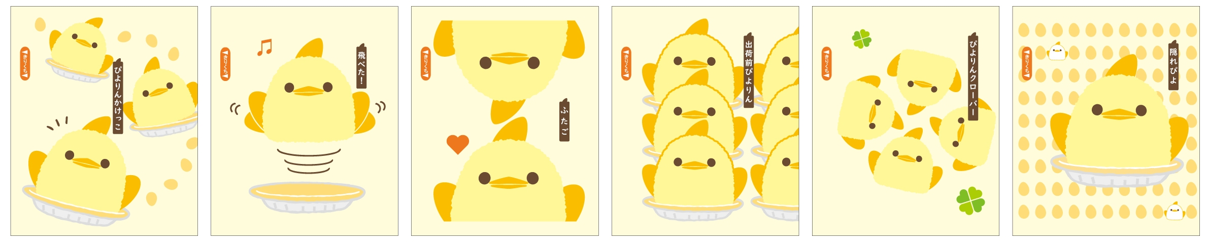 「ぴよりんかけっこ」「隠れぴよ」「出荷前ぴよりん」など、食事が楽しくなる、かわいいぴよりんのイラスト全6種です。