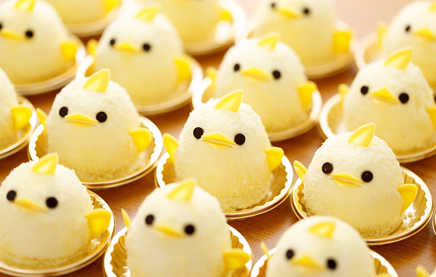 愛知県の地元食材「名古屋コーチン」の卵を使ったプリンを、バニラの香り豊かなババロアで包み込み、粉末状にしたスポンジをまとわせました。ふんわり「ひよこ」の形に飾り付けた生スイーツです。