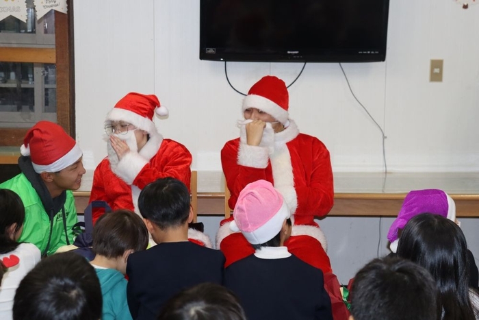 同園の本園集会所では約20人の子どもたちが学生サンタの到着を出迎え、プレゼントをいっぱい詰め込んだ袋をかついで二人のサンタさんが登場すると大喜びでした。名前を呼ばれた子どもたちは順番に希望のプレゼントを受け取り、代表の児童が「今年もありがとう。皆で楽しみます。来年も来てください」とお礼の言葉を述べました。