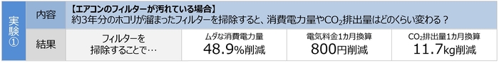 約3年分のホコリが溜まったフィルターの場合、ホコリを取り除いてキレイな状態にすることで、フィルターの目詰まりで余分に発生していた48.9%分の消費電力量を削減できました。1ヵ月の電気料金やCO2排出量に換算すると、800円の電気料金、11.7kgのCO2を削減できたことになります(実験①)。フィルター掃除に加えて、さらに室外機周辺の障害物を片付けて風通しも良くすると、余分に発生していた105.1%分の消費電力量が削減でき、1ヵ月あたりの電気料金1,720円、CO2排出量25.2kgの削減につながりました(実験②)。