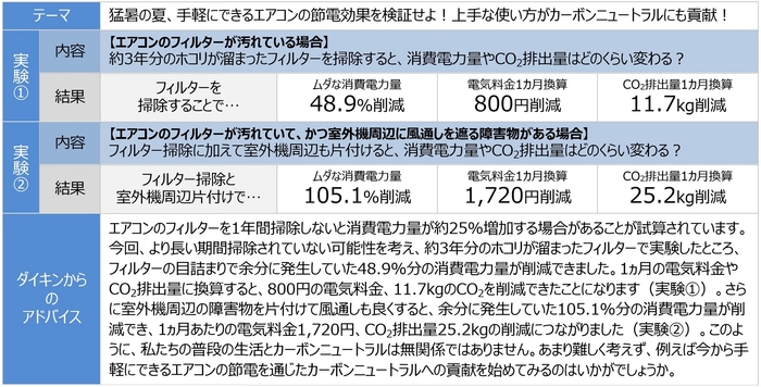 ダイキン工業株式会社は、このたび、エアコンのフィルター掃除や室外機周辺の片付けによる具体的な節電効果を探るため、実際の住宅に設置されているエアコンを使った実験を通じて調査し、結果をまとめました。
