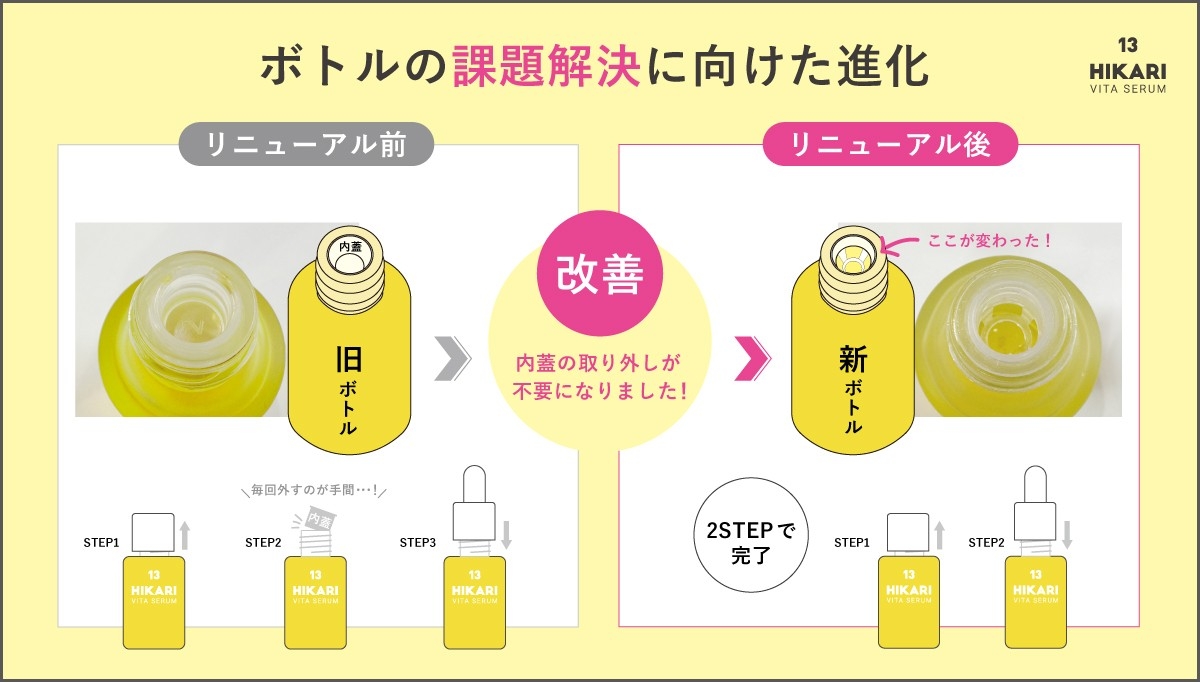 高濃度ビタミンC配合の美容液は、その効果の高さから近年の美容市場で人気を集めていますが、ビタミンCの特性上、酸素や光に触れると効果が低下するという課題があります。これまでの「ヒカリビタセラム」では、製品の酸化を防ぐため内蓋を使用していましたが、使用時には毎回この内蓋を取り外す必要があり、ユーザーの利便性に課題がありました。