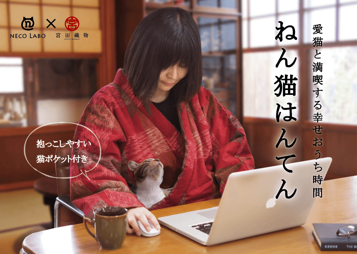 SNSでとあるお寺の投稿を見つけました。それはとても羨ましい光景で、住職の着物の懐に猫がぴったりと収まり、密着したまま気持ちよさそうに寛いでいるのです。その投稿を見た商品開発の担当者は思い立ちました。「そうだ!着物ではなくはんてんにすれば気軽に着られる。懐にポケットをつけて猫が入れるようにしよう」と。