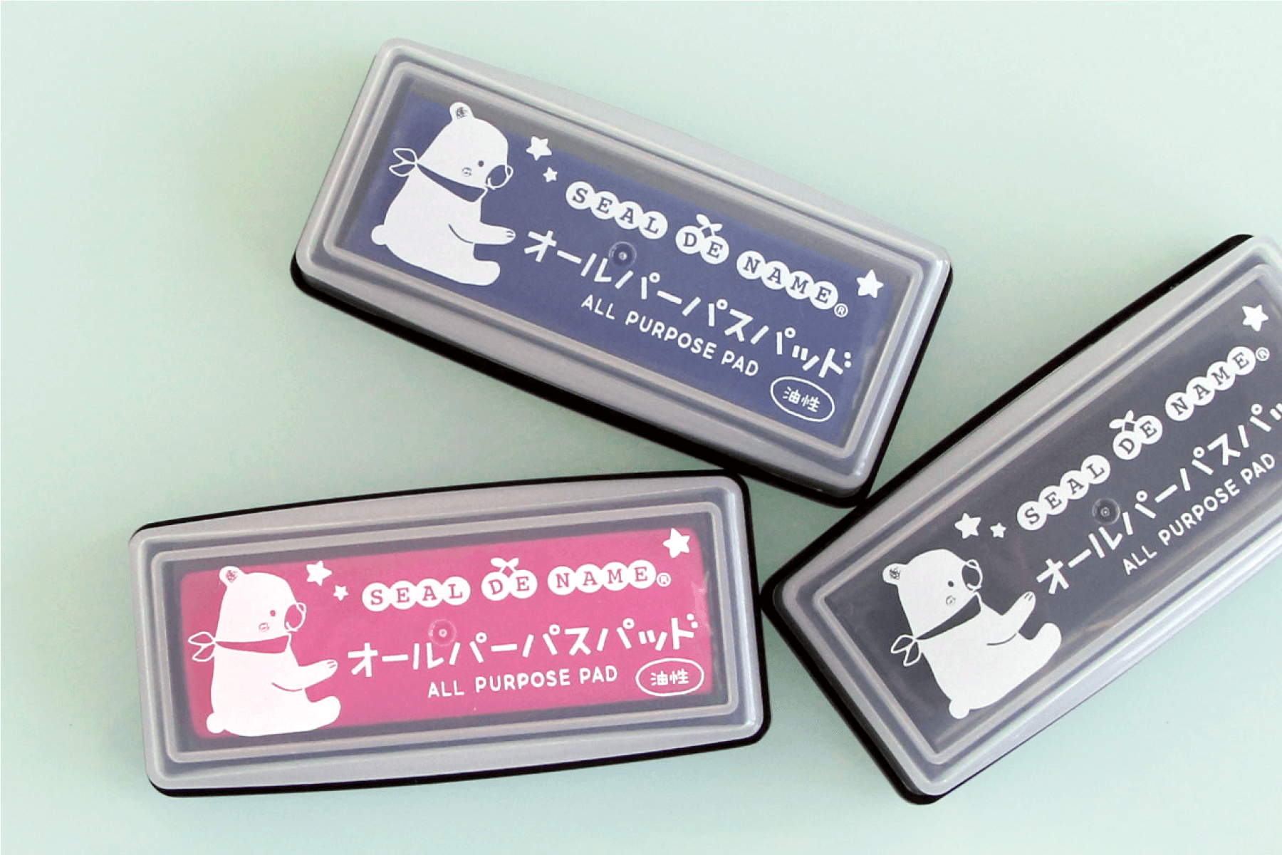 スタンプ2本セットに付属しているオールパーパスパッドは、インクカラーをブラック・ブルー・ピンクの3色から選ぶことができます。油性マジックのような万能インクを使用しているので、速乾性で消えにくくアイロン不要でお洗濯も可能です。
