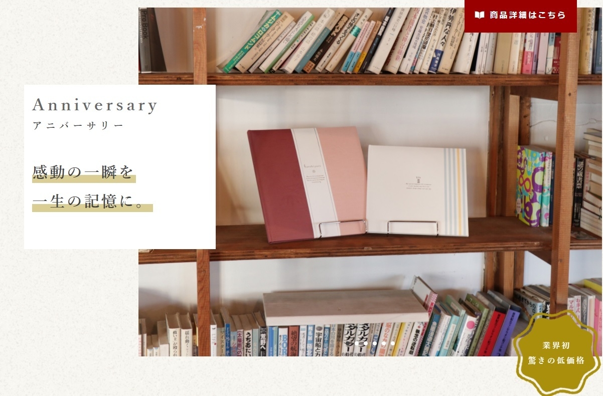 フォトボの最高級ラインナップ、Anniversary(アニバーサリー)とは、結婚式や成人式、七五三、長寿のお祝いなど、お客様の記念すべきライフイベントの記録のために、印刷から装丁にいたるまでこだわり抜いた、フォトブック業界内で最高品質のフォトブックです。