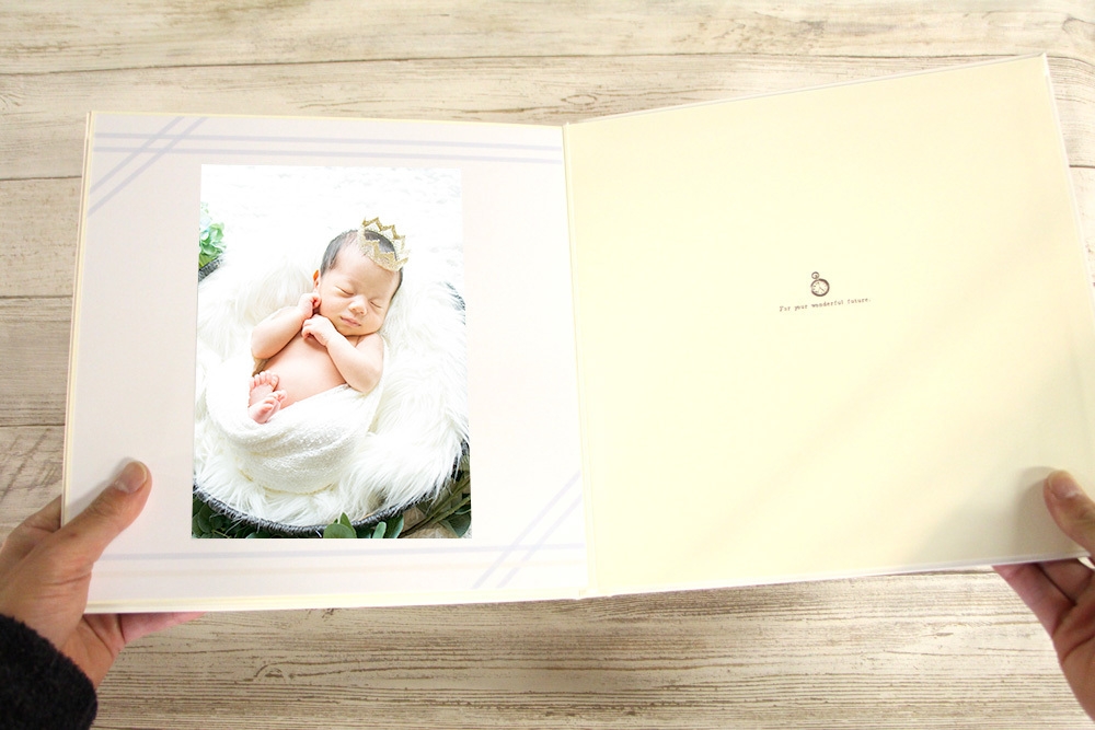 長い年月の保管に備えて、表紙と同じデザインの専用化粧箱をご用意いたしました。湿気や日光など、経年の環境変化からお客様の思い出を大切に守ります。