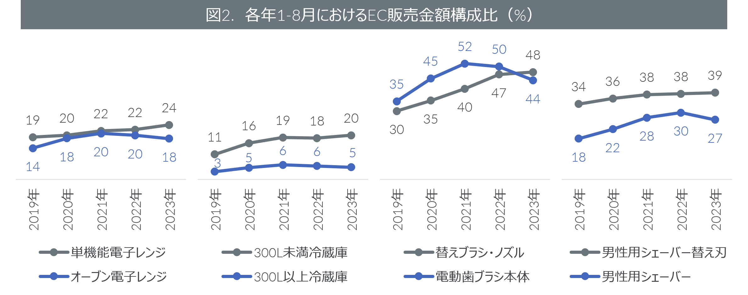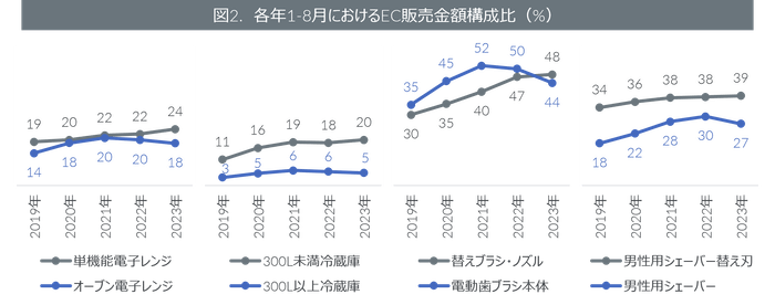 2023年は全般的にEC市場の拡大に一服感がみられているものの、一部の製品においてはEC比率が拡大しているものもあった。コロナ禍で拡大したEC市場が今後どのような変化を見せていくのか、引き続き注目が集まる。