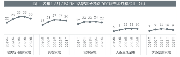 ・2023年18月におけるEC販売金額構成比は、5つの生活家電分類*2で前年同期から13%ポイント縮小