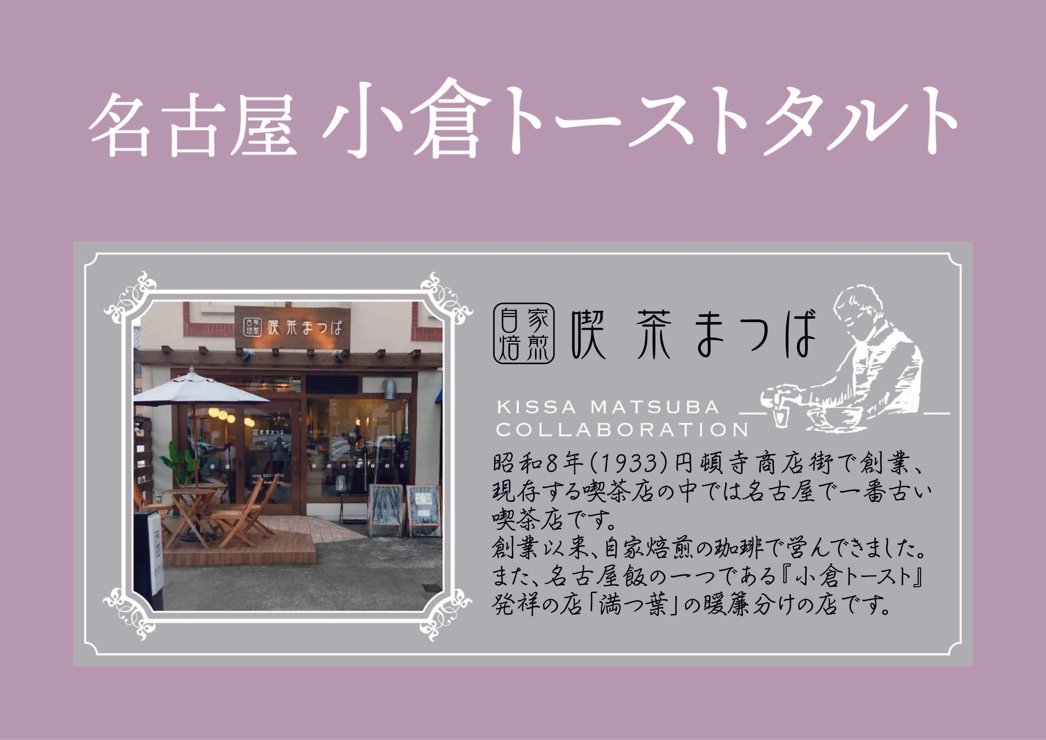「小倉トースト」の発祥はかつて名古屋市の栄地区に存在した「満つ葉」という喫茶店と言われています。その小倉トースト発祥の店から味を受け継ぎ暖簾分けをしたのが円頓寺商店街に昭和8年に創業した「喫茶まつば」。名古屋で一番古く、歴史ある喫茶店です。「喫茶まつば」様監修の元、小倉トーストをイメージした新スイーツ「小倉トーストタルト」を発売いたします。