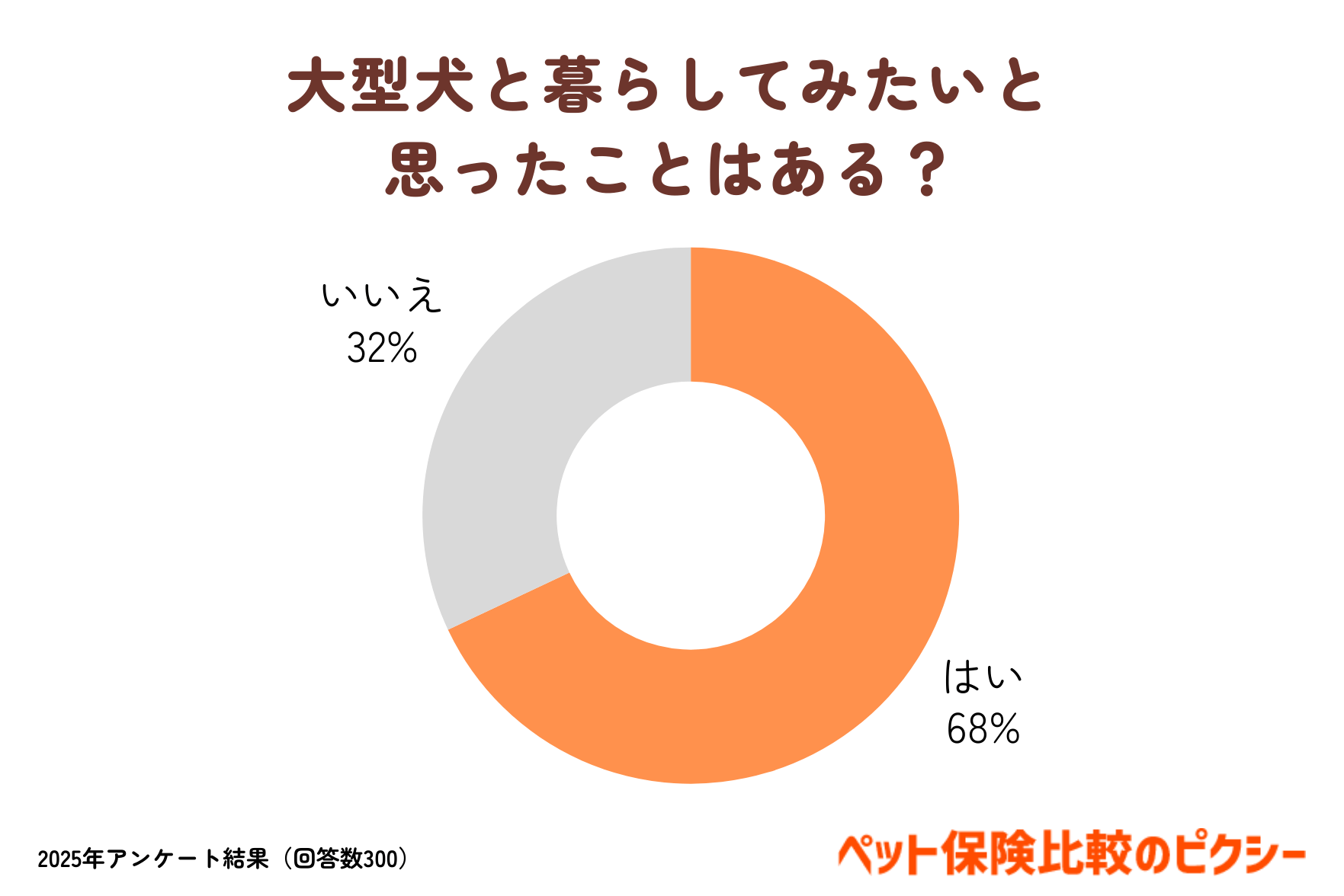 小型犬、中型犬の飼い主さまに、大型犬と暮らしてみたいと思ったことがあるか尋ねたところ、68%もの方が「はい」と回答しました。