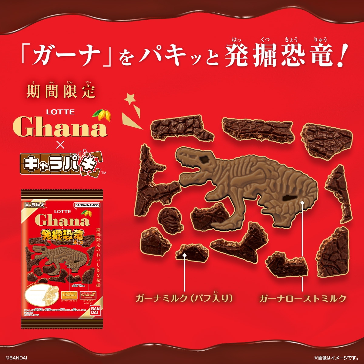 株式会社バンダイ キャンディ事業部では、板型チョコレートをパキパキ割って恐竜のチョコを型抜く「キャラパキ発掘恐竜チョコ」と、発売60周年を迎えるロングセラーブランドの「ガーナ」がコラボレーションした『キャラパキ発掘恐竜チョコ ガーナコラボver.』(税込108円)を2024年12月23日(月)より順次、全国量販店のお菓子売り場にて販売開始いたします。