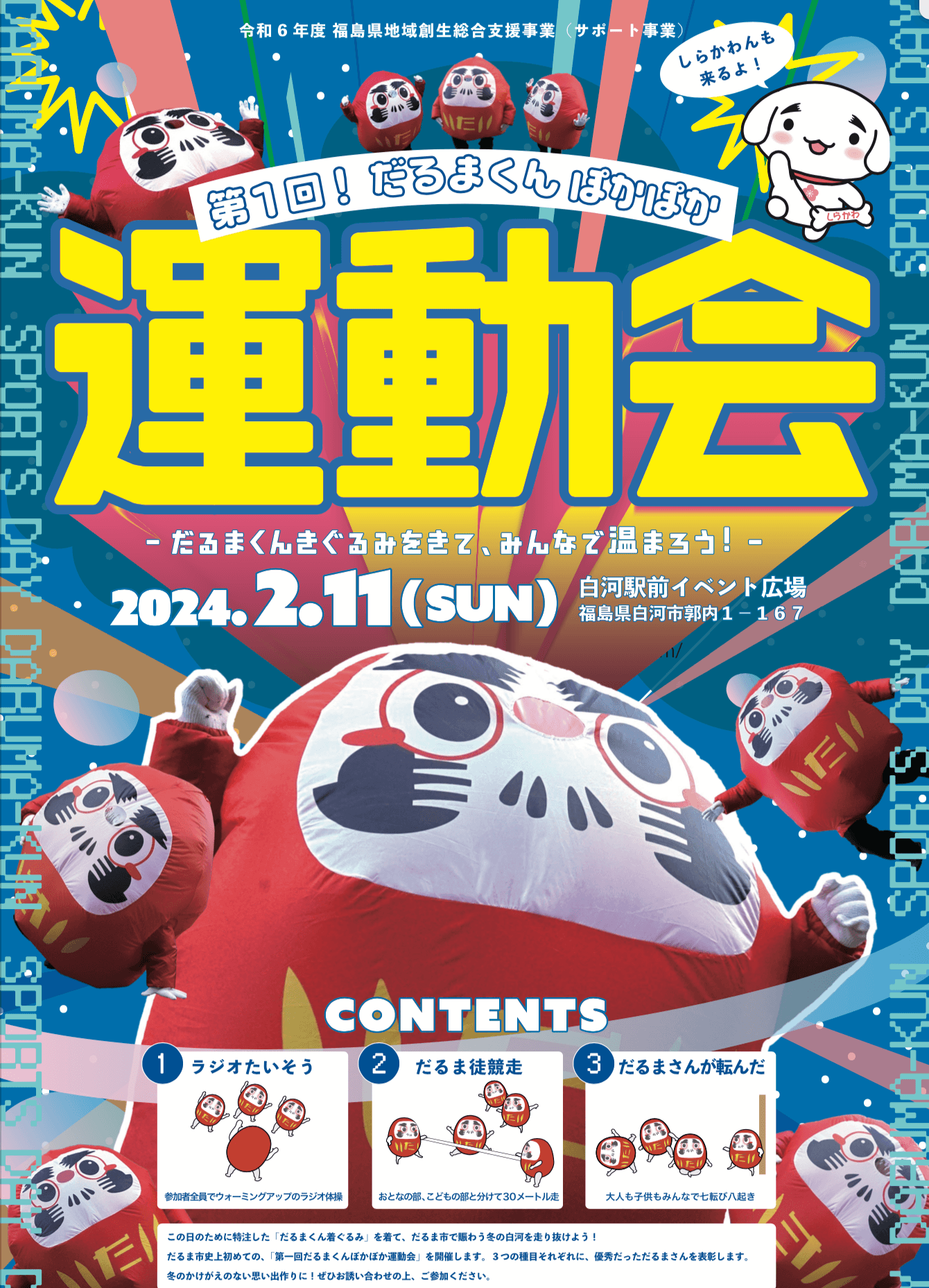 本イベントでは、だるまの着ぐるみを着て徒競走やだるまさんが転んだなどの種目を行い、来場者にだるま市での思い出作りの場を提供することで減少傾向の続く白河だるま市のさらなる活性化につなげることを目的としています。