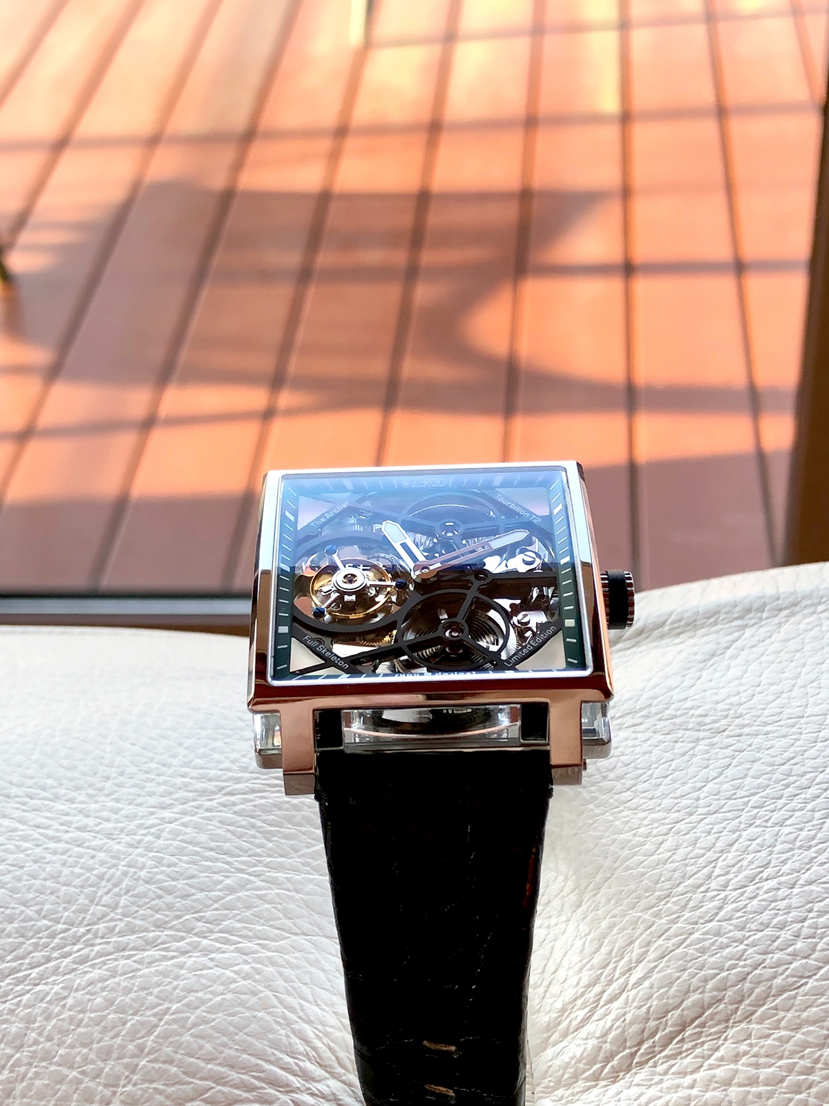 新モデルのローンチにあたり、初代から進化したポイントは、ミドルケースの素材をアクリルガラスから水晶ガラスにアップグレードしたこと、カラーリングを一新したこと、新たにスクエアケースのモデルが追加されたこととなります。