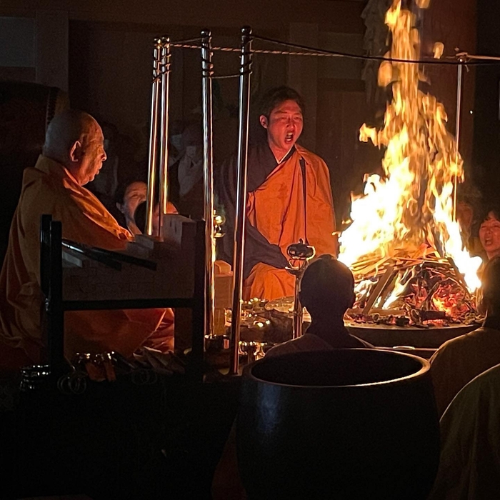 この2日間清浄心院の氏神様3体(大黒天・弁財天・稲荷大明神)を御開帳し、住職 池口恵観による「家門繁栄・商売繁盛祈願」特別護摩行祈願をおこないました。初日には、約20名の高野山僧侶と新井貴浩元プロ野球選手にも登壇いただき、護摩業の後に新井様より、これまでの池口住職との出会いや修行についてお話しいただきました。