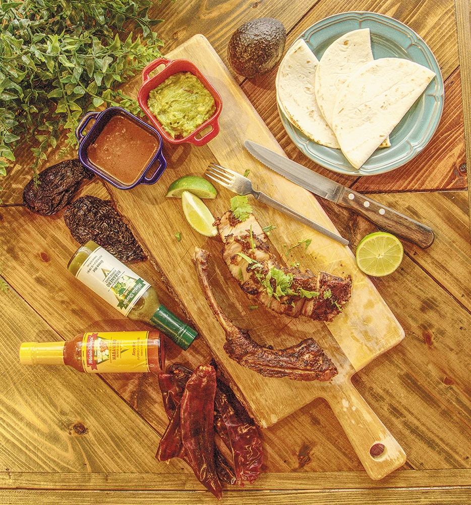 (焦がしチレソースに漬け込んだ炭火焼きポークトマホークステーキ、ワカモレ、サルサロハアサダ、フラワートルティーヤ3枚)