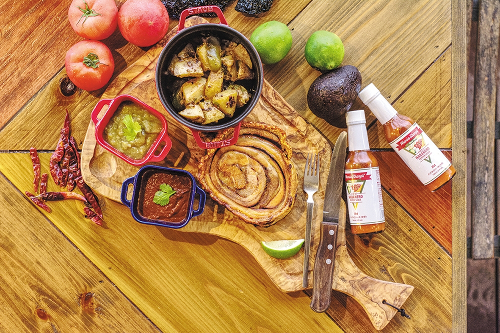 (特別な“サルサロカ”ソースに漬け込んだ300gの炭火焼きフランクステーキ、パプリカ、レッドオニオン、ハラペーニョ、ワカモレ、パクチー、フラワートルティーヤ3枚)