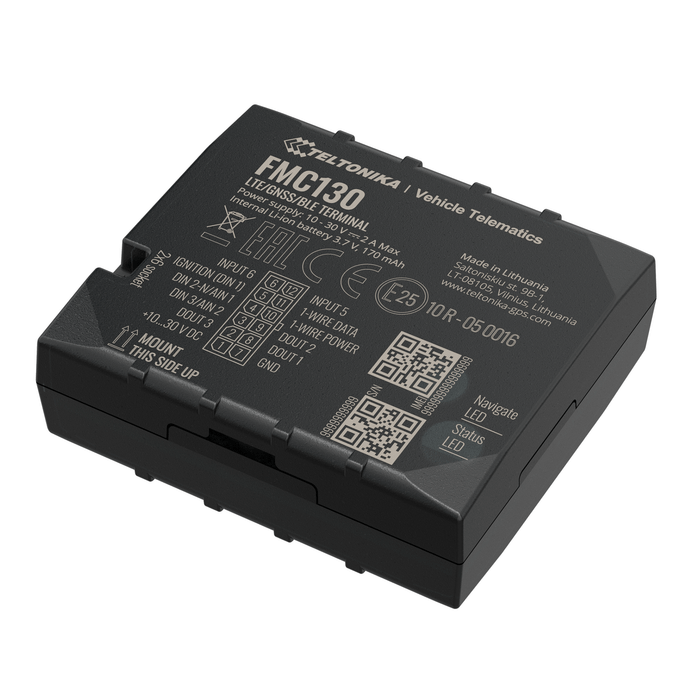 FMC130は、4G LTE(Cat 1)、GNSS、Bluetoothおよび内部GNSS/LTE アンテナを備えた小型デバイスです。この製品は、設定可能なデジタル/アナログ/ネガティブ/インパルス入力、3つのDOUT出力、Bluetooth、バックアップバッテリも装備しています。またネガティブ入力を備えていることから、車両ドアセンサー、アラームボタン、シートベルト検出、その他のセンサーやアクセサリーなどを接続する際のインテグレーション時間を節約できます。
