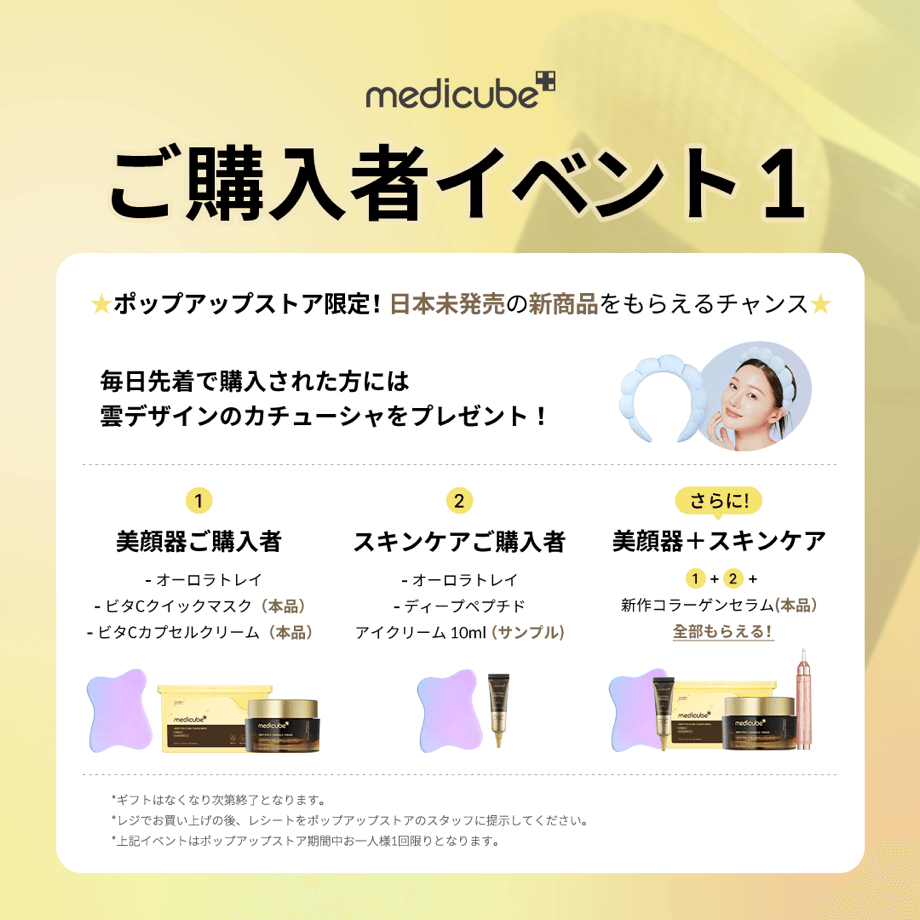 今回のPOP UP STOREでは今年2月に新発売した1台6約のトータルケア美顔器「AGE-Rブースタープロ」をはじめ、「2023年Qoo10ベストコスメ美顔器部門」の1位、2位を獲得した美顔器「AGE-Rダーマエアショット」、「AGE-Rスキンブースターショット」など計13点を販売いたします。店頭では各種美顔器のほか、スキンケア商品もお試しできます。さらに、メディキューブのスキンケア商品サンプルがもらえる来店イベントや商品をご購入していただいた方のための豪華イベントもご用意しております。この機会にぜひご来店くださいませ。