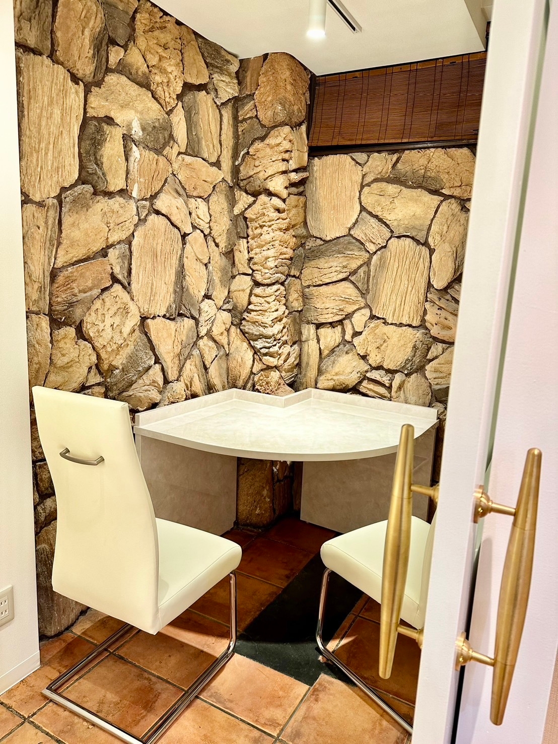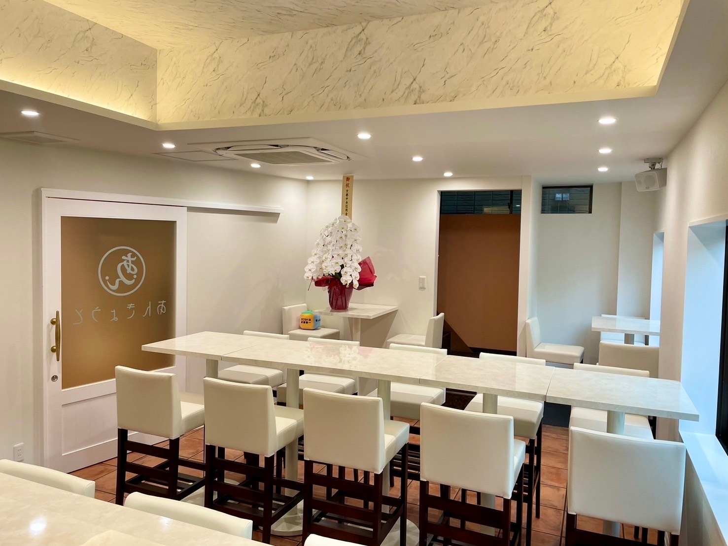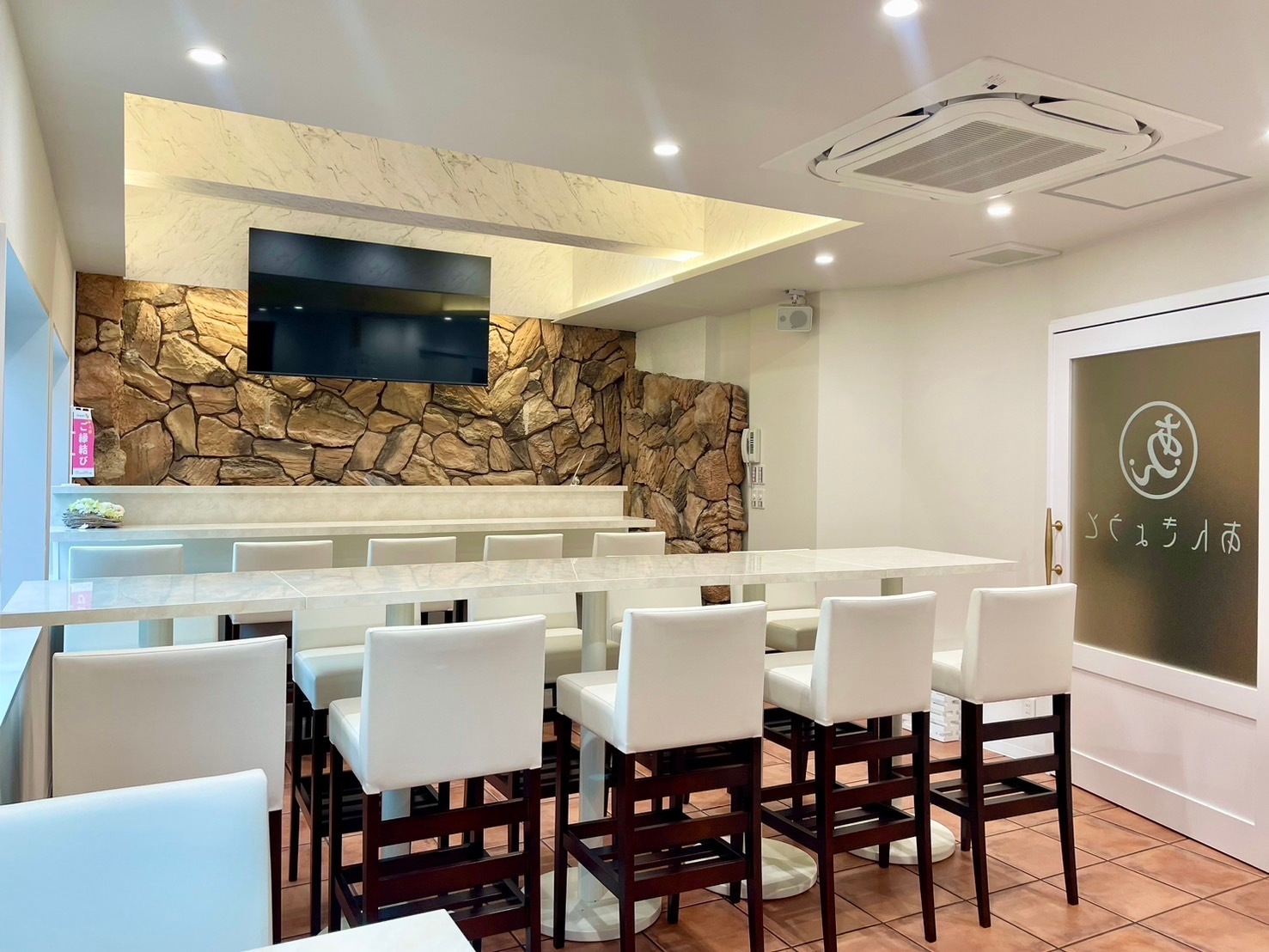 四条富小路下ルに所在する「あんきょうと」には、20名着席可能な独身バー等を展開する、飲食スペースと2名着席の完全個室を完備。一階は内装真っ黒な「やきとりの笑い屋」、二階へ上がれば別世界で真っ白な「あんきょうと」になります。