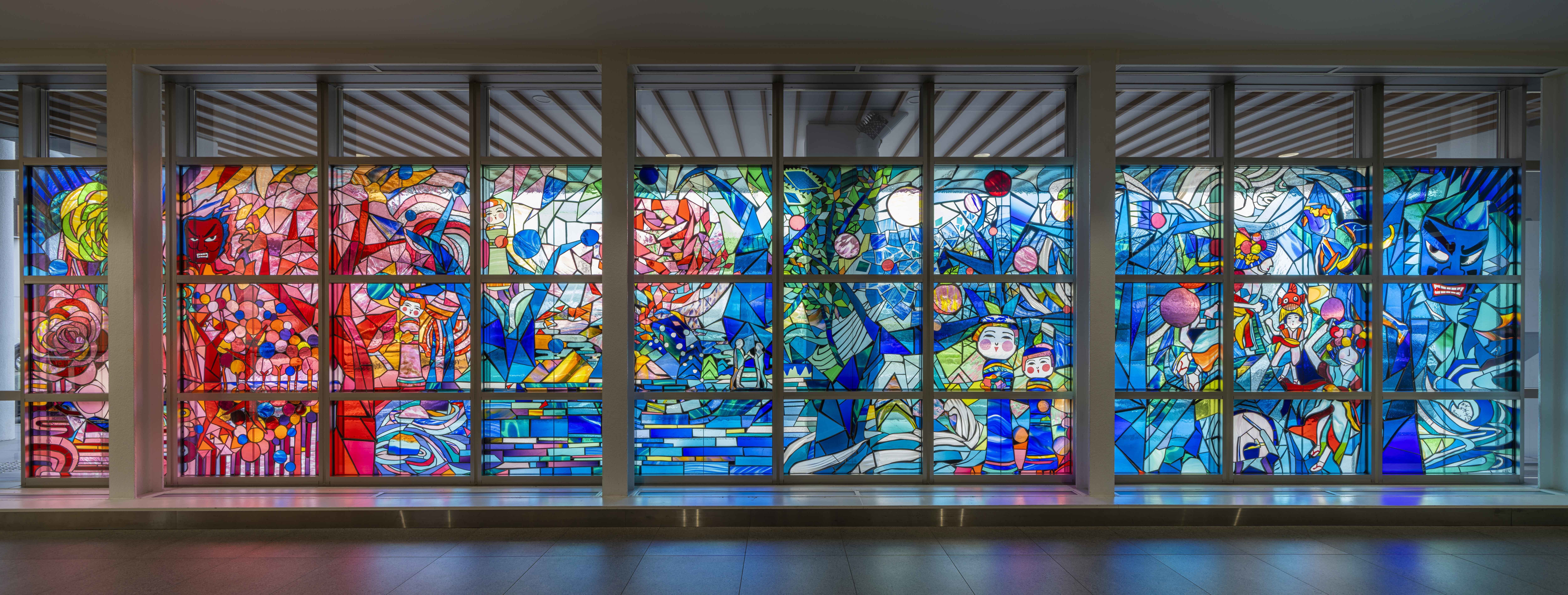 青森空港の大型ステンドグラス「青の森 へ」は、青森県三沢市出身のアートディレクター森本 千絵氏が切絵で制作した原画をもとに、クレアーレ熱海ゆがわら工房(静岡県熱海市)が製作したステンドグラス作品です。本作品には、森本氏が幼少期にみた青森県の豊かな自然や文化が85色約3,200ピースものガラスで色鮮やかに描かれています。