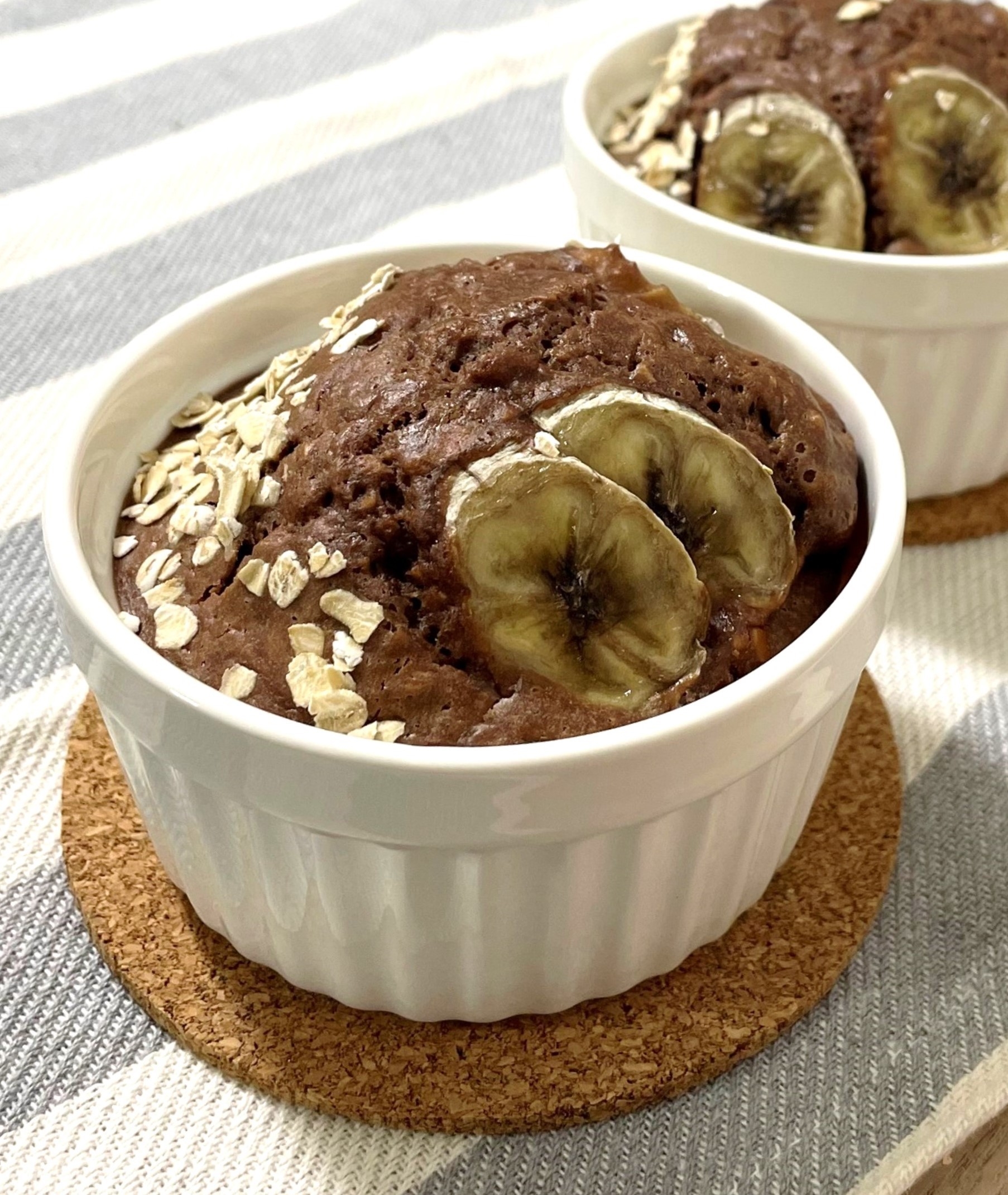 (5) 耐熱のココット7~8分目の高さまで入れ、平らにならす。上に輪切りにしたバナナとお好みでオートミールをのせ、オーブントースターで約15分焼く。(竹串を刺し何もついてこなければOK。小さいココットで作る場合は約10~12分で焼きあがります。)