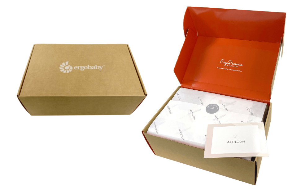 Ergobabyからのメッセージが添えられた特別なボックスでお届けします。『AERLOOM』はair(空気)とloom(繊維)を組み合わせて、Heirloom(家宝)にかけたネーミング。新しい命の誕生を祝福するギフトにおすすめです。
