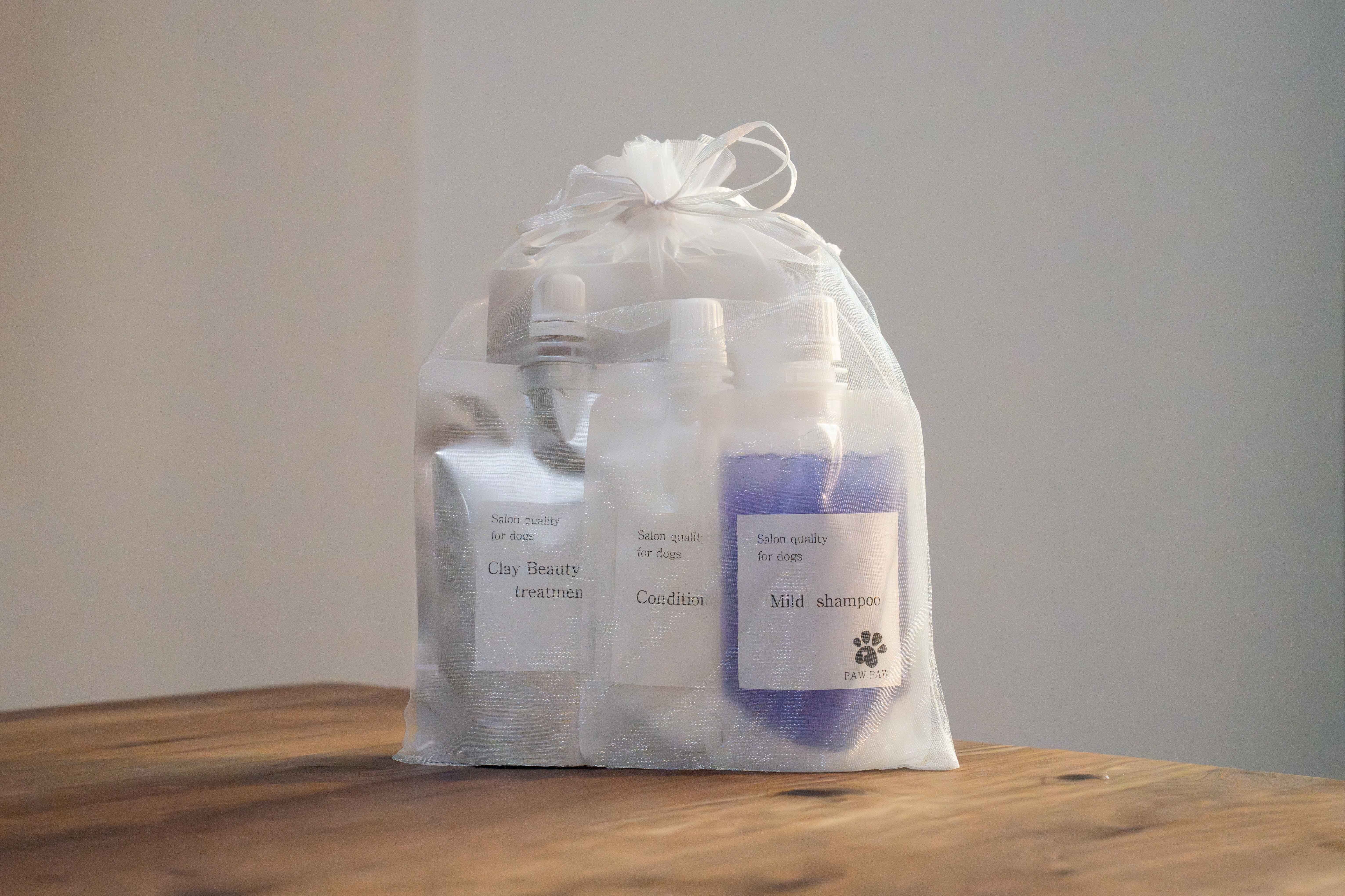 (ワンちゃんシャンプー/50ml、ワンちゃんコンディショナー/50ml、クレイパック/100mlの3点セット)