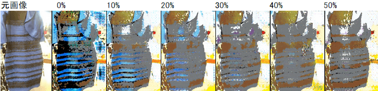 ![図2 DNNモデルの機械学習[4]時にブルー・バイアス画像を混ぜて比率を変えたモデルに対し、#TheDress画像でテストした結果の例。左から、元画像(入力画像)と、ブルー・バイアス画像の比率が0%〜50%の場合の出力例。図の上のパーセントの値が増えると、青/黒から白/金へと変化している。実際は、同じ条件で10回繰り返してDNNモデルを作成し評価している。](/attachments/SgxpgpH9qGS1bx1C4dak.png)