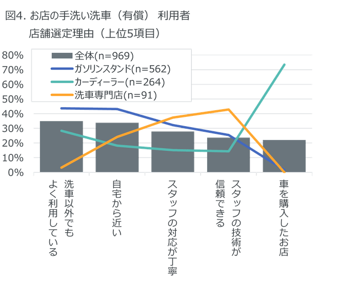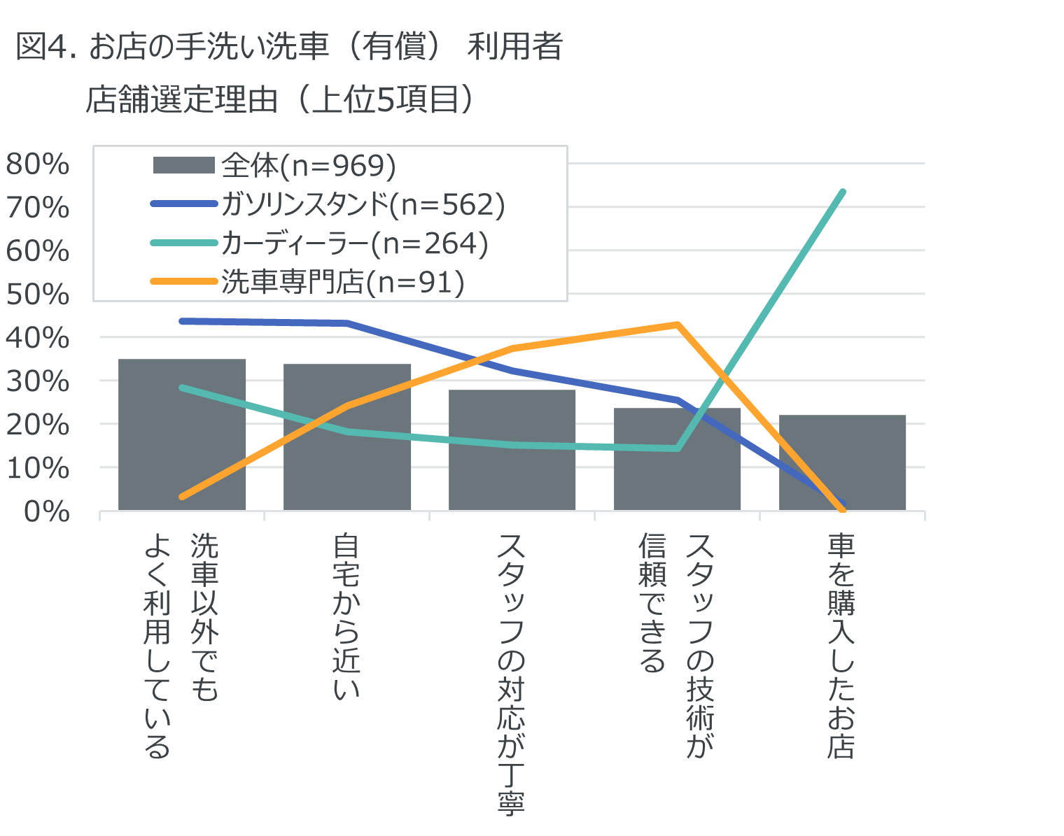 お店の手洗い洗車を利用する理由は「車全体をまとめてきれいにしてくれる」が55%と最多で、「いつもお願いしているお店/スタッフがいる」が30%と洗車技術を信頼し依頼している様子がうかがえる。利用店舗はガソリンスタンド(58%)に続き、カーディーラー(27%)、洗車専門店(9%)であった。その店舗に洗車を依頼した理由については、「洗車以外でもよく利用している(35%)」、「自宅から近い(34%)」が上位に挙げられた。(図4)。洗車専門店の利用者では「スタッフの技術が信頼できる」が最も高く43%であった。車に複数回コーティングを施工したことがある人では、主な洗車手段として「お店の手洗い洗車」を利用する人が17%に上り、車への愛着が高く、美観維持へのこだわりが強い様子が見受けられる。