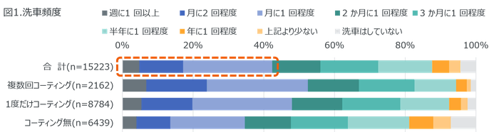 自動車保有者15,223人に対し洗車の頻度について調査したところ「月に1回程度」のペースで洗車をする人が最も多く25%を占め、月に1回以上洗車をする人は42%に上った(図1.オレンジ枠)。「3か月に1回程度」が16%、「半年に1回程度」が15%であった。車にコーティングをしている人は月に1回以上洗車をする割合が高く、購入時などに1度コーティングをした人では48%、複数回コーティングをした人では53%と愛車を綺麗に保ちたいという意識がうかがえる。洗車のきっかけでは「ボディの汚れが目立った」という回答が79%と圧倒的に多く、2番目の「前回から一定期間が経過」は19%、3番目の「フロントガラスの汚れが目立った」は16%に留まった。月に2回以上洗車をする人は「フロントガラスの汚れが目立った」が26%、「雨が降った後」が22%と車の汚れに対して敏感な様子が見られた。主な洗車手段については、自分で手洗いする人が49%、洗車機を利用する人が41%で両者を合わせて9割に至った。また、お店の手洗い洗車(有償)を利用する人は7%であった。
