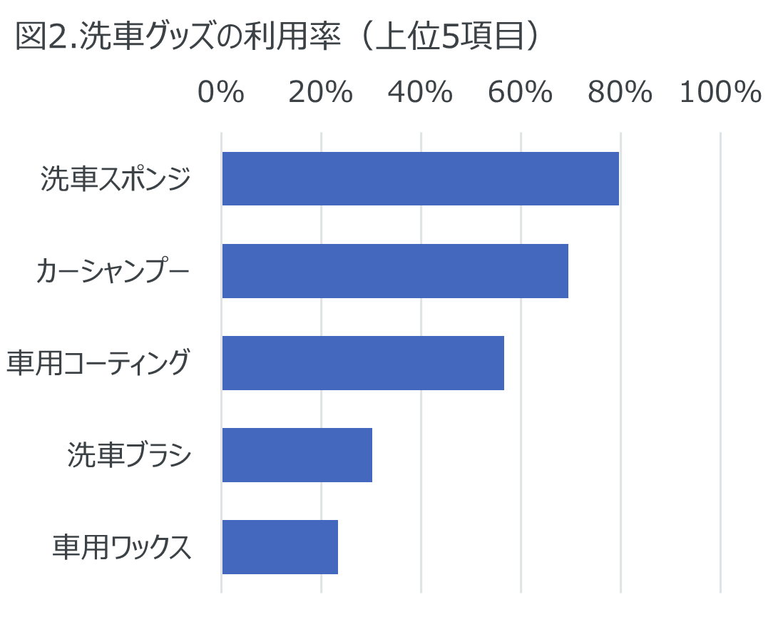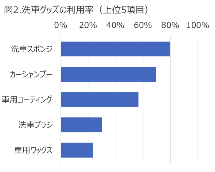 自分で手洗い洗車をする人の多くは自宅の駐車場や庭(86%)で行っており、洗車場を利用する人は9%であった。洗車時に使用する用品では洗車スポンジが80%、カーシャンプーが70%、車用コーティングが57%であった(図2)。カーシャンプーなどの用品を購入する際に参考にしている情報源は「インターネット上のレビューなど」が12%、「商品パッケージ」や「店頭の販促物」が10%、「YouTube動画」が8%であった。洗車頻度が多い人ほどインターネットのレビュー、YouTube動画を見る割合が高い傾向が見られ、よく使うアイテムだからこそ使用感を確認したいものと思われる。