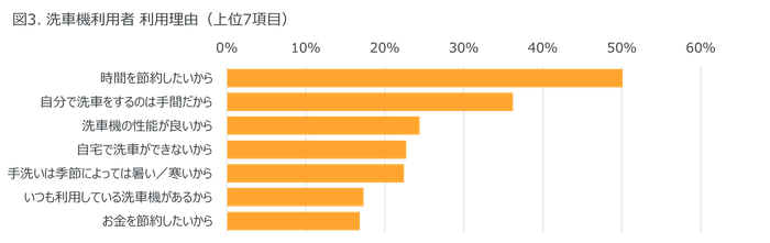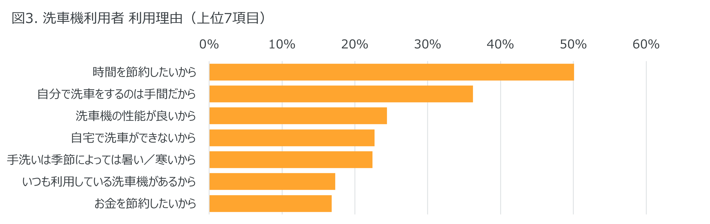 ・ 洗車機利用者は「時間の節約(50%)」と「手間の省略(36%)」を利用理由の上位に挙げた。