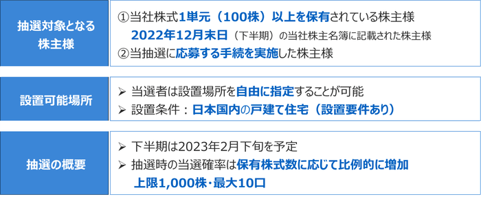 2022年下半期は、2022年12月末の当社株主名簿に記載された株主様のうち、本抽選にご応募頂いた方を抽選対象として3名様を当選者として選出し、「太陽光発電システム(100万円相当、工事代・メンテナンス込み)を戸建住宅(新築及び既築)に無償で設置する権利」を贈呈します。また、今回から株主様のご期待にお応えすべく、無償設置の対象に蓄電池(100万円相当、設置代込み)も追加することを決定いたしました。