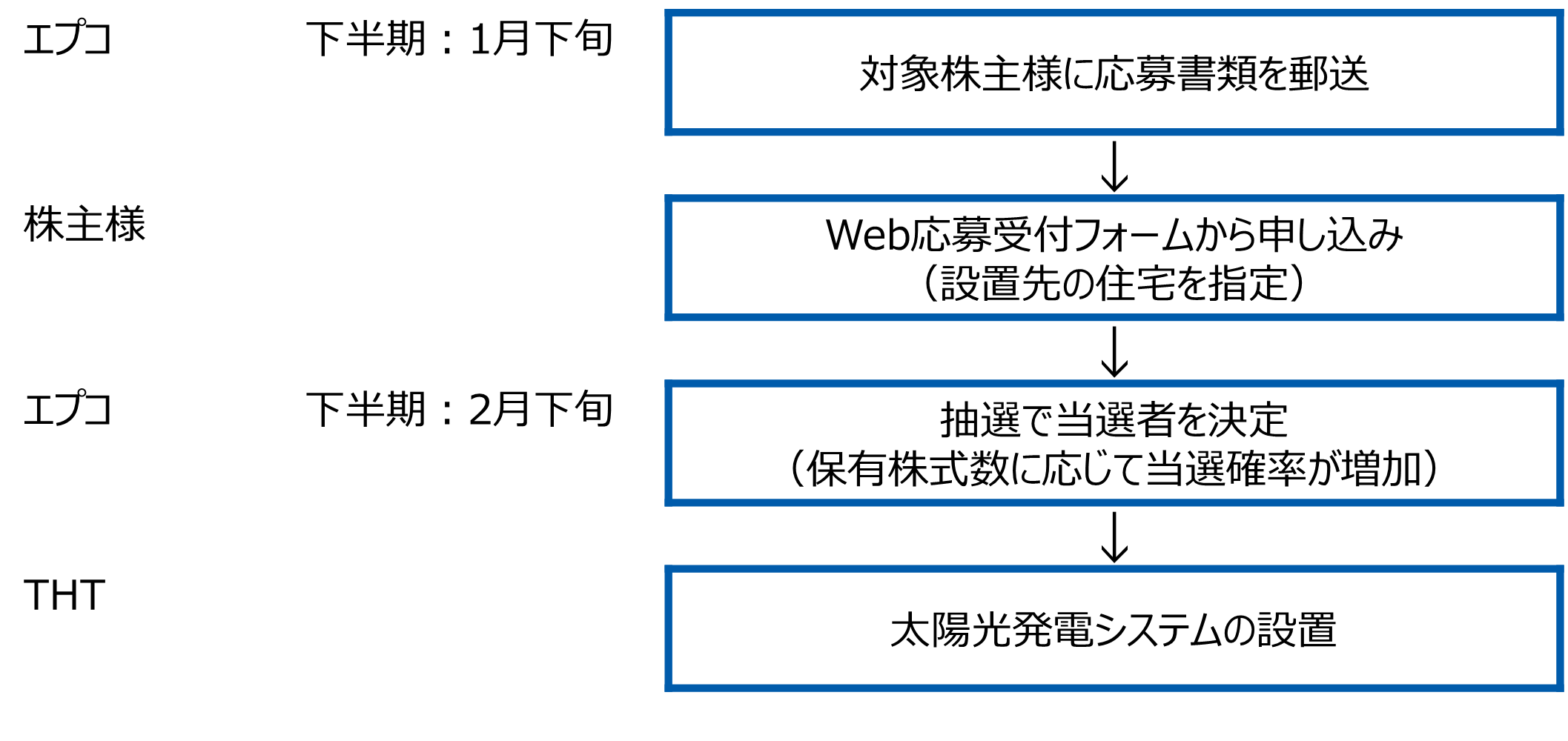 株式会社エプコ(本社:東京都墨田区、代表取締役グループCEO:岩崎 辰之、証券コード:2311)は、2022年5月に新設しました抽選式株主優待制度について、上半期(6月末)に引き続き、下半期(12月末)も実施いたします。12月末時点(権利付最終日12月28日)で当社株式を1単元(100株)以上保有されている株主様のなかから抽選で3名様、ソーラーパネルのほかに蓄電池も選択可能にし、無償で設置する権利を贈呈いたします。