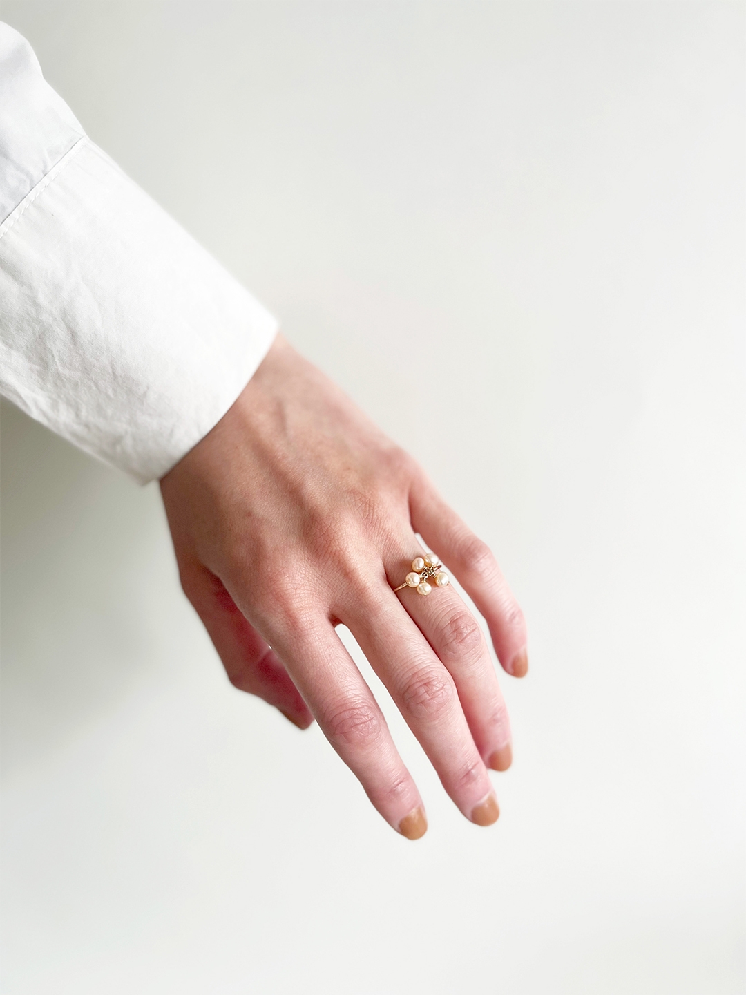 ANCHOVY ジュエリー日本発売1周年を記念した可憐なお花モチーフのリング「フラワーパールリング」は、肌馴染みの良いナチュラルピーチカラーの淡水パールをお花のように見立て贅沢に使用したリングです。