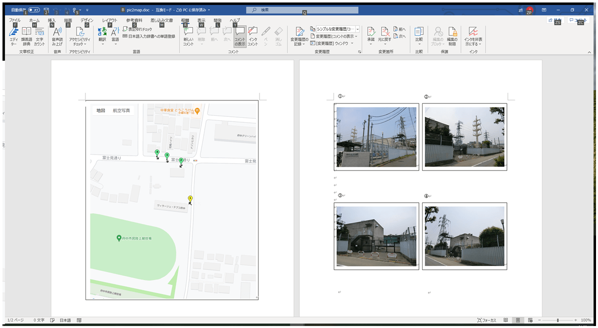 これらのフォーマットや出力項目は、インストール時に付属するWordのテンプレートファイルの中身次第で変更できます。インストール時に付属するWordのテンプレートファイルは、pic2map.docmとpic2map.docです。このテンプレートファイルを書き換えるだけで、出力内容を変更できます。
