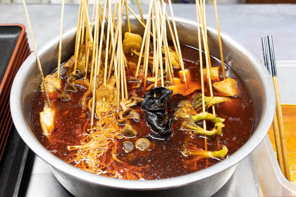 ガチ中華の中でも池袋は中国へ旅している気分が味わえるスポットが多く、人気のエリアとなっています。特にガチ中華ファンが必ず足を運ぶのが池袋の雑居ビルに入っている「友誼食府(ゆうぎしょくふ)」。ここのフードコードでは珍しい中国各地の地方料理を提供するお店が6店舗入っていて、メニューや飛び交う言葉も中国語。四川、上海、東北、台湾などの料理があり、中国全土を一瞬で旅した気分を味わえます。中でも最近の人気は四川料理店「香辣妹子(シャンラーメイズ)」の「冷鍋串串(ロングオツァンツァン)」。串に刺し味付けされた肉や野菜、うずらの卵などから好きな具材を選び、自分好みに唐辛子ペーストなどをつけて食べる激辛料理。冷えているので辛くても食べやすく、手軽にシビ辛体験ができます。また、フードコートの隣には中華食材を販売しているスーパーマーケットもあり、現地で販売されている食材が手に入ります。